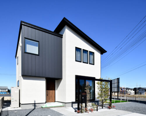 白の塗り壁調の外壁に、黒のスリットライン。さらに片流れ屋根を組み合わせた躍動感のあるフォルムは、街の中でもひときわ洗練された存在感を放っています。