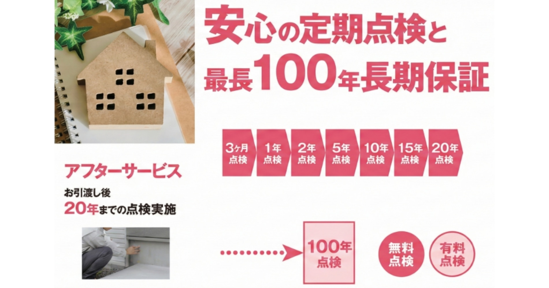 家は建てて終わりではありません。初期保証20年、最長100年の長期保証など、将来かかるメンテナンスコストやアフターサービスについても詳しく解説しています。