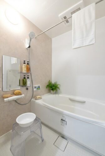 落ち着いた色合いでまとめ、快適なバスタイムを楽しめます。