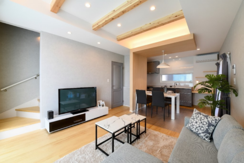 折り上げ天井×化粧梁: 天井を一段高くし、木の温もりが伝わる化粧梁を配置。圧倒的な開放感を実現しました。