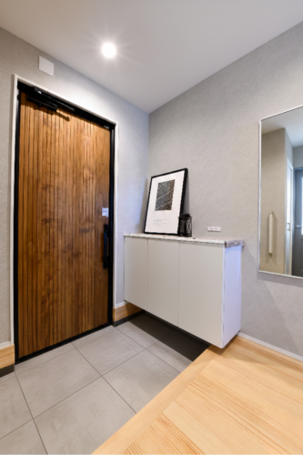 外観のクールな印象から一転、玄関ドアを開けると、無垢材の柔らかな香りと質感に包まれます。