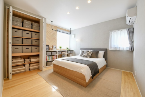 賢い収納プラン: 大容量のクローゼットに加え、腰高のオープンシェルフを設置。ボックスを活用した「隠す収納」と、本や写真を飾る「見せる収納」を両立させています。