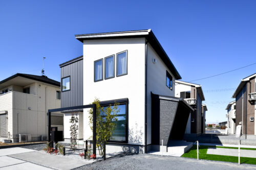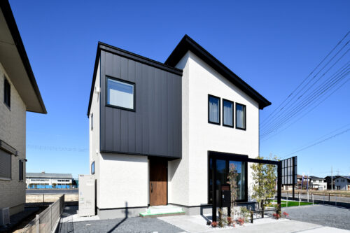 白の塗り壁調の外壁に、黒のスリットラインが映えるスタイリッシュな邸宅。