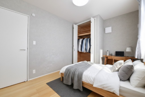 寝室は、グレージュの壁紙を基調とした落ち着きのある仕上がりに。