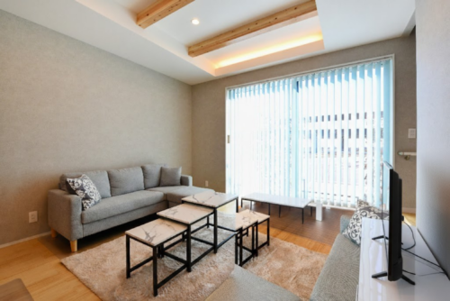 キッチンとの繋がり: 木目調のゲートがキッチンエリアを緩やかに仕切り、家具のような一体感を演出。グレーの壁紙や建具をベースに、大理石調のテーブルなどモノトーンの家具が映える、ホテルのラウンジのような空間です。