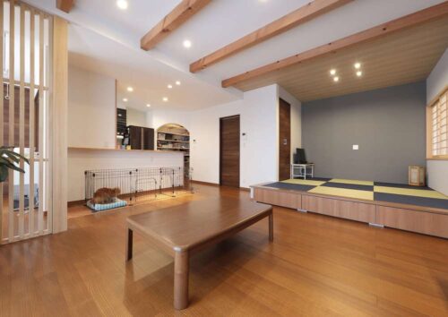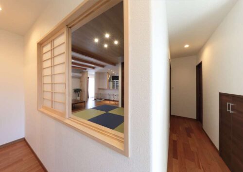 LDKの畳コーナーは、遊び心のあるカラー畳を敷いた癒しの空間。廊下側の壁面に障子を設け、家族とのコミュニケーションにも便利