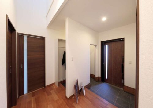 シューズインクローゼットからも出入りのできる、ゆとりの玄関ホール。吹き抜けから自然光が優しく差し込み、明るく心地よい雰囲気