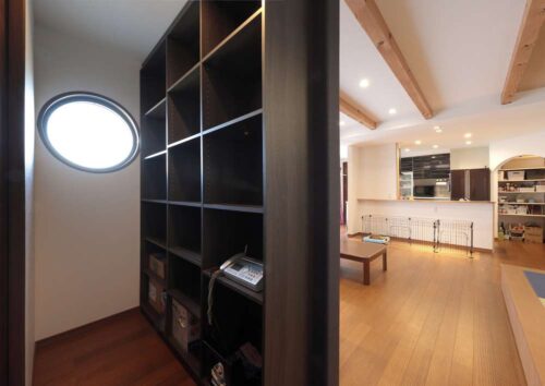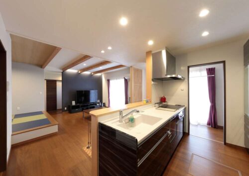 ご紹介で新築のご依頼をいただいたO様。「地元の工務店」ということで、厚い信頼を寄せていただき、大切な家づくりをお任せいただきました。開放的なLDKには、オープンな畳コーナーや仕事場としても使える大きな可動棚のあるスペースを計画。家族の存在を感じながら、それぞれが心地よく過ごせる“居場所”をお造りしました。素敵なご家族O様と、アフターサービスを含め、末永くお付き合いをしていきたいと思っています。