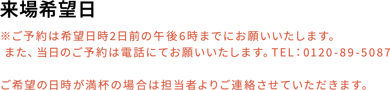 第一希望日必須 時間を選択してください10:0011:0013:0014:0015:0016:00 第二希望日任意 時間を選択してください10:0011:0013:0014:0015:0016:00 お名前必須 メールアドレス必須 電話番号必須 その他気になることがあればお問い合わせください任意 個人情報保護方針に同意する※ 個人情報の保護について インターネットを通じて当ウェブサイトの「お問い合わせ」をご利用いただいた際に、必要な情報の元となるお客様の個人情報の取扱いを行いますが、お客様の個人情報を、お客様の同意なしに第三者に開示することはありません。